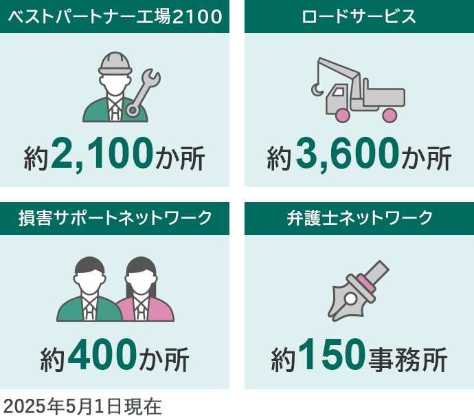 また、お車の損害については、三井住友海上・あいおいニッセイ同和の全国に広がる損害調査サービス網をフル活用!万一の際も、MS&ADインシュアランス グループでの事故対応品質をご提供します!